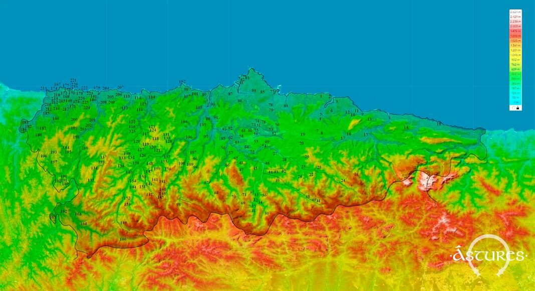 En Asturias el relieve es mucho más abrupto. En el mapa que hice para esta entrada utilicé uno de altitud y relieve [efn_note] https://es-es.topographic-map.com/ [/efn_note] al que le superpuse el de Fanjul Peraza[efn_note] Fanjul Peraza, Alfonso. (2004). Los castros de Asturias. Una revisión territorial y funcional.[/efn_note] donde cada número es un poblado fortificado.