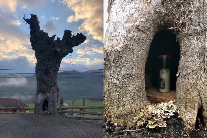 A veces tienes la suerte de fotografiar cosas como esta que veis. Se trata de un viejo roble situado al lado de una capilla en una pequeña localidad del concejo de Lena. En el hueco que dejó al crecer pude ver cómo habían colocado un cirio. Las fotos se tomaron el 2 de marzo de 2025.