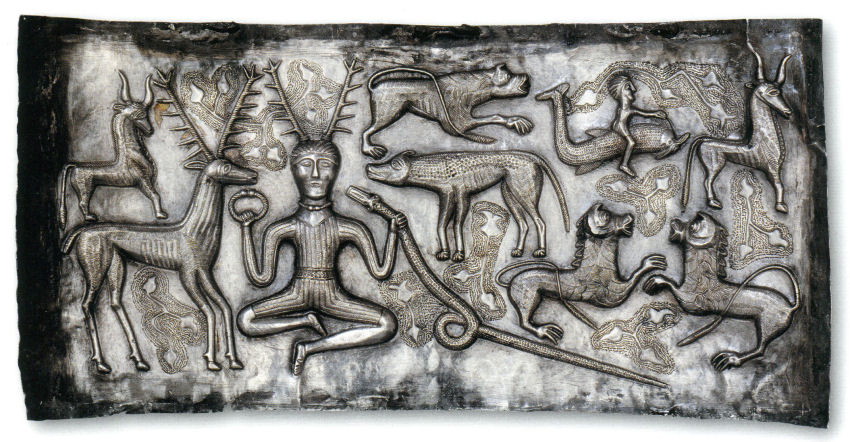 - La representación del señor de los animales.(C.6571) Aparece en la parte izquierda una figura de un hombre con cornamenta de ciervo que sostiene un torques y el cuello de una serpiente en sus manos. A su lado un conjunto de distintos animales, y una figura de un hombre a lomos de un delfín. Se ha considerado tradicionalmente que se trata del dios Cernunnos, el señor de la naturaleza del panteón celta.