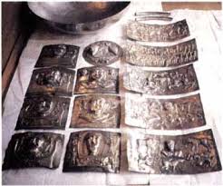 Pues podríamos decir que son cinco piezas rectangulares a modo de paneles, junto con siete más cortas y una base redonda que componen un objeto realizado casi por completo en plata considerado como la pieza más grande de orfebrería en este metal precioso de la Edad del Hierro. Las piezas de las paredes están hechas en plata de una pureza del 97%. Además contiene revestimientos de oro, soldaduras de estaño e incrustaciones de vidrio para los ojos de algunas figuras.