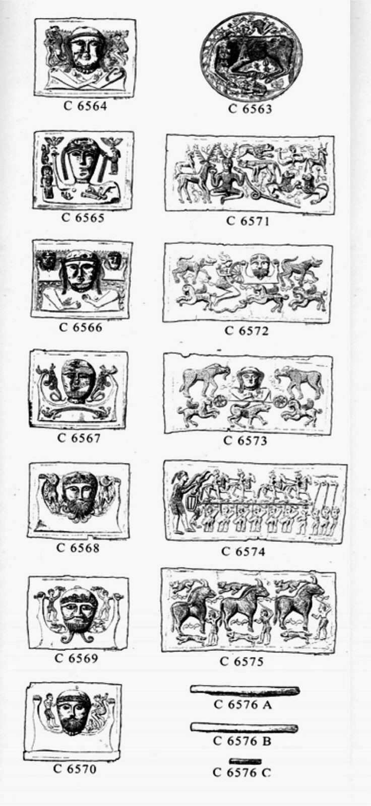 - La batalla de los toros (C.6575). Esta placa fue llamada así por la representación de tres toros y tres guerreros entre ellos. Les acompañan perros o lobos entre las figuras, así como otras representaciones en el fondo. Se cree que puede tratarse de una representación del Tain (Olmsted)