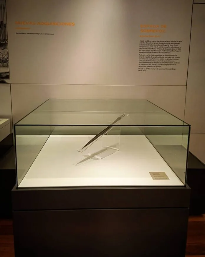 La generosa donación de la espada de Sobrefoz viene a enriquecer los ya extraordinarios fondos del Museo Arqueológico de Asturias pero, aun siendo un hito fundamental en su biografía, no significa más que el comienzo de otra etapa en su propia historia, un tiempo nuevo en el que, mediante el estudio tipológico y metalográfico, los investigadores pueden desvelar aspectos hasta el momento desconocidos. Con su entrada en el Museo, se abre la posibilidad de profundizar en el conocimiento de las técnicas metalúrgicas practicadas durante la Edad del Bronce en Asturias y de verificar si, tal vez, los armeros que la fundieron y forjaron se sirvieron del cobre que durante siglos proporcionaron las minas de El Aramo o El Milagro a nuestros artesanos prehistóricos.
