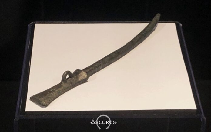 En la exposición Bronces se puede ver expuesta una pieza que resulta muy llamativa por lo inusual. Apareció en las intervenciones de 1997 bajo el pavimento de una cabaña circular que se encontraba en un estrato antiguo, entre los siglos VI y IV a.C. fecha, esta última, que se corresponde con una cerámica griega de ese periodo encontrada en ella1.