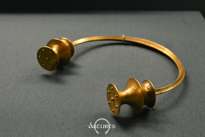 Su decoración y remates lo encajan dentro de la «escuela flaviense» cuyas características los hacen similares a los de la «escuela asturiana«, siendo dos áreas cuya relación aún no comprendemos, pero que debería ser estudiada, como bien apuntaba Óscar García-Vuelta en las recientes conferencias sobre el oro en la Antigüedad. Las terminaciones en doble escocia, huecas, con decoración de motivos radiales y florales, con glóbulos de oro, etc… son las mismas características que definen a los torques astures del centro oriente de Asturias.